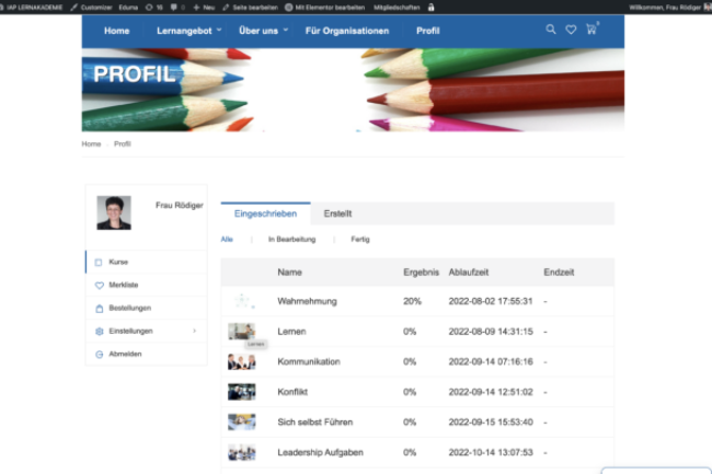 Ziel des Projektes war es, einen Prototypen für ein Kursportal mit LMS- und Shopfunktion zu erstellen. Basierend auf WordPress wurden u.A. folgende Features implementiert: