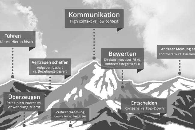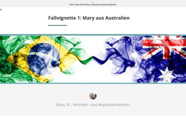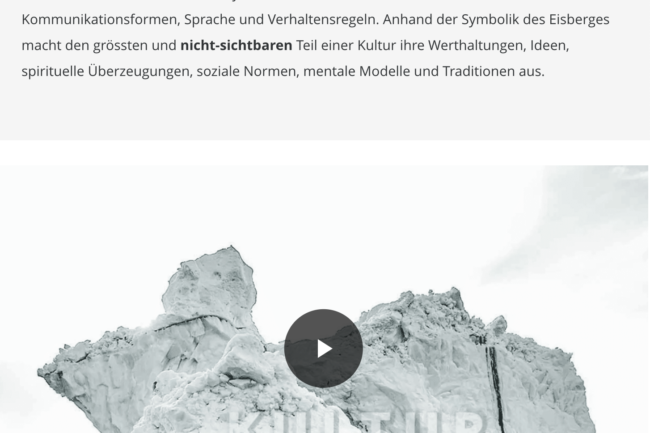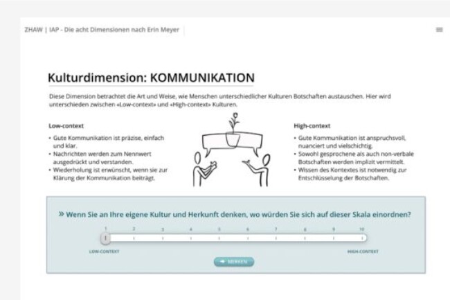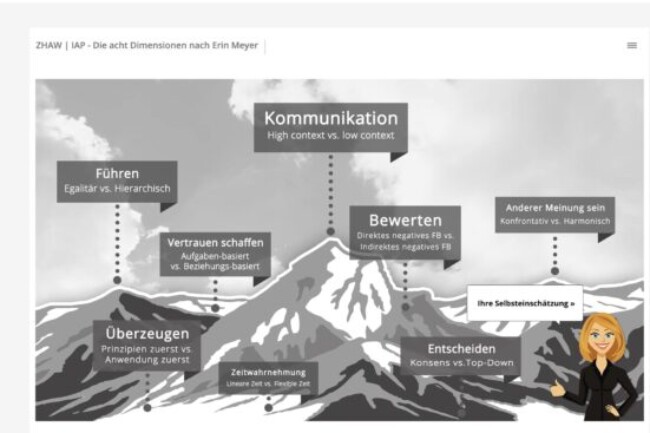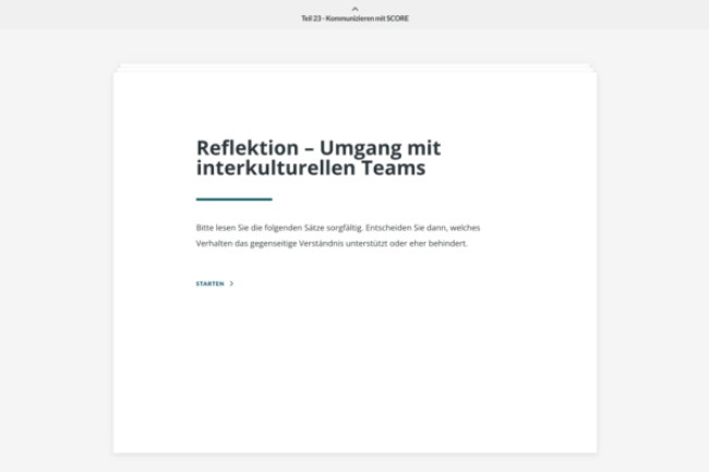 Begleitend zum Weiterbildungskurs im Bereich interkulturelle Forschung beinhaltet das Web Based Training ein Einführungsvideo, Theorieblöcke mit Audiokommentaren, Fallbeispiele und interaktive Elemente wie Prozessabbildungen, Bilderklärungen mit Hotspots, Drag & Drop oder Quizzes. Auch wurden Animationen erstellt und ein individuelles Storyline-Modul zur Selbsteinschätzung programmiert.