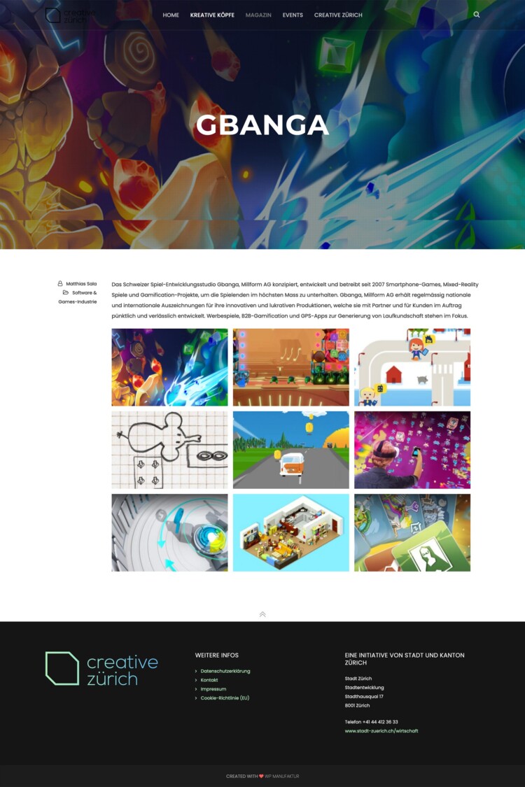 Die Website dient als Schaufenster der Kreativwirtschaft im Raum Zürich. Kreativschaffende haben die Möglichkeit, sich durch einen kostenloser Eintrag vorzustellen, sich mit ihren Projekten und Firmen sichtbar zu machen und Teil der Community zu sein. Weiterhin bietet die Seite relevante News und Veranstaltungshinweise der Branche.
